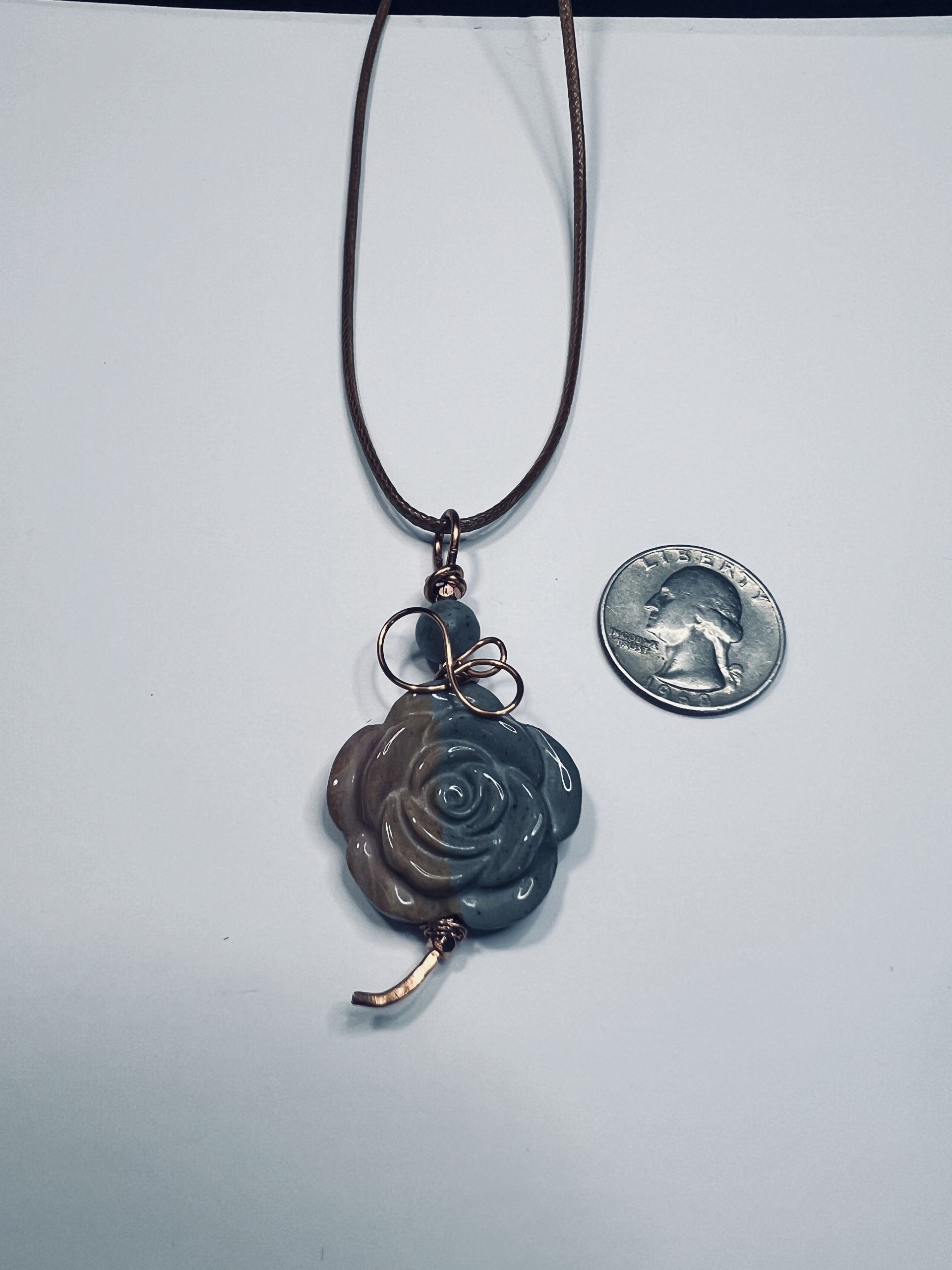 This handcrafted pendant features a beautifully carved jasper rose in soft gray and earthy taupe tones, shaped into a detailed floral design with a smooth, polished finish. The rose is accented with warm copper wire, including a delicate loop detail at the top and a subtle curved accent below, adding visual balance without distracting from the stone’s sculpted form. Paired with a coordinating brown cord, this piece has a natural, understated elegance.
