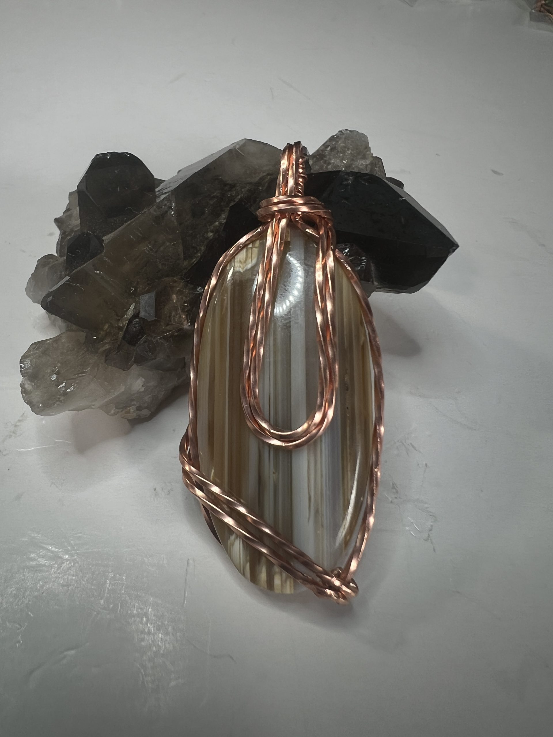 Hand-wrapped in twisted copper wire, the setting enhances the stone’s organic lines while adding warmth and artisan character. The hammered and twisted details provide subtle texture, giving the piece strength and dimension without overwhelming the stone’s natural beauty.