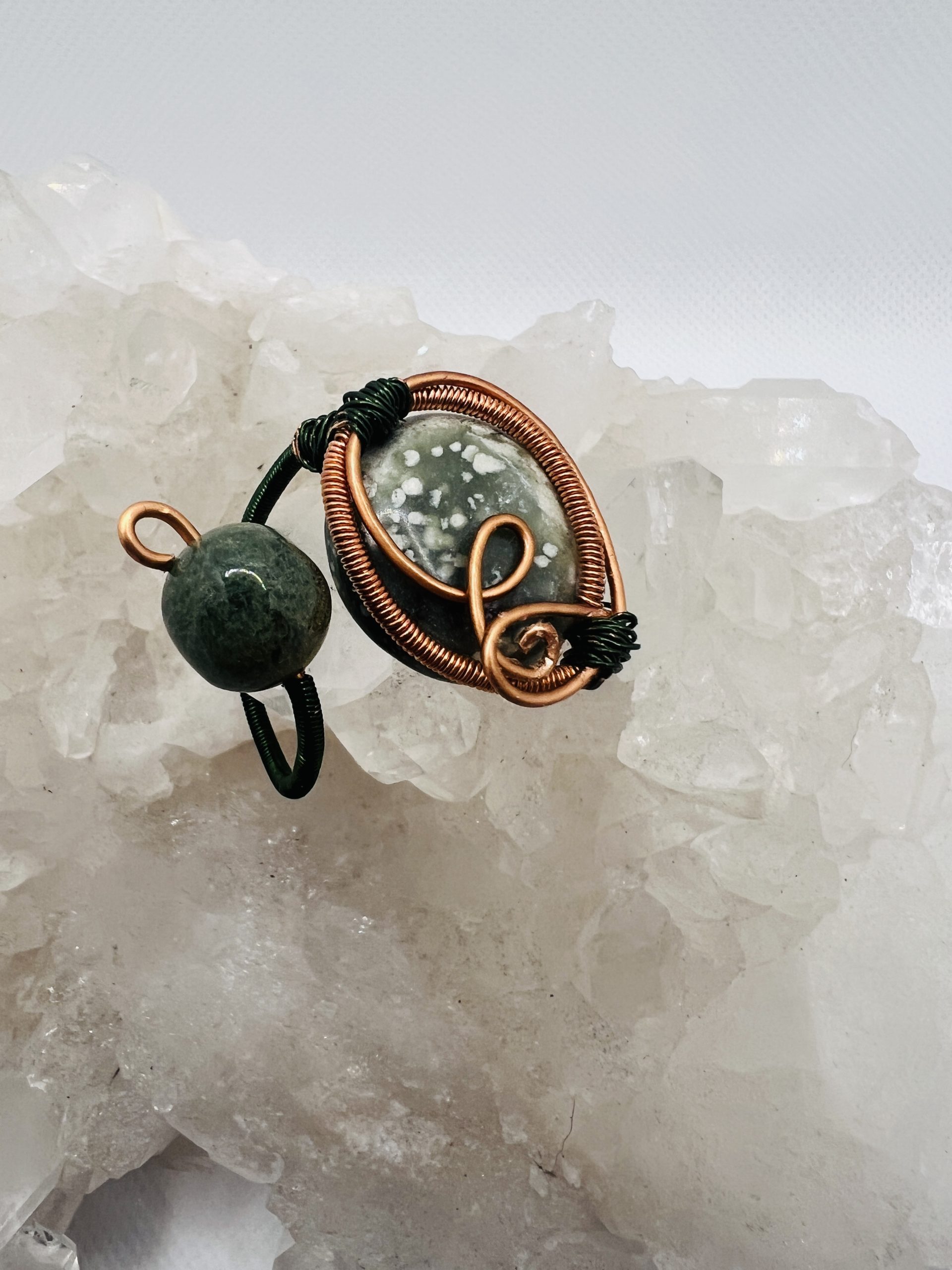 This one-of-a-kind pendant features a softly patterned Peace Jade stone, hand wrapped in warm copper wire and accented with Aventurine. Flowing wire details create an organic, sculptural frame that highlights the natural character of the stone while allowing each element to remain distinct.